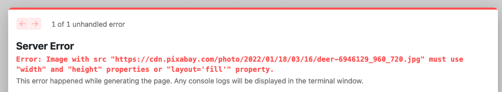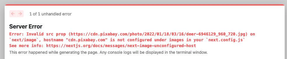 domains: ['cdn.pixabay.com'] // 이곳에 에러에서 hostname 다음 따옴표에 오는 링크를 적으면 된다.