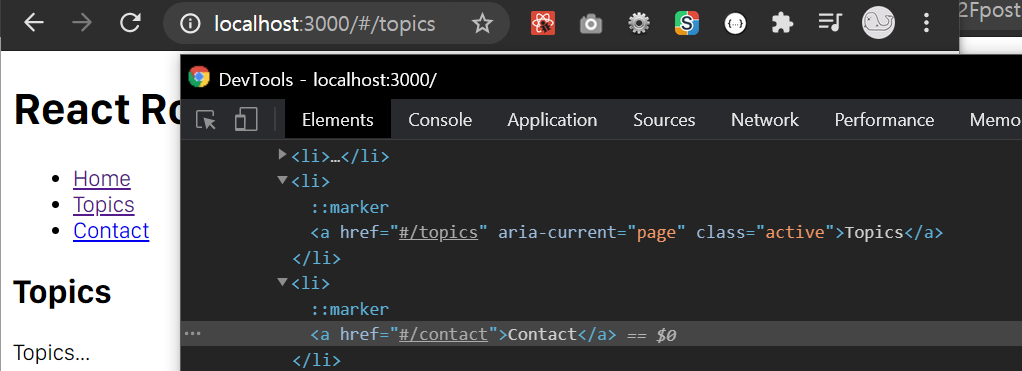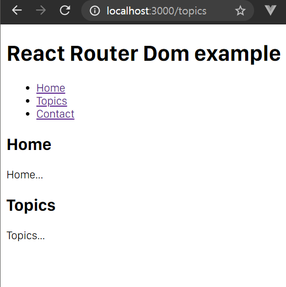 예를 들어, localhost:3000/ 는 Home 컴포넌트가, localhost:3000/topics는 Topics 컴포넌트가 나오는 것이다.